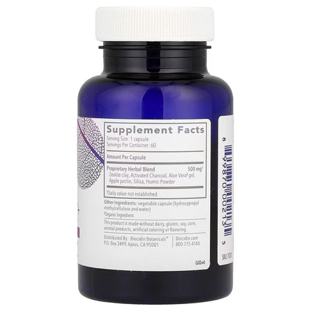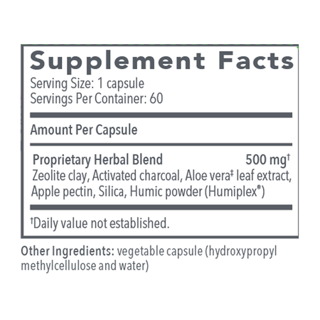 Proprietary Herbal Blend: Zeolite clay, Activated charcoal, Aloe vera leaf extract, Apple pectin, Silica, Humic powder (Humiplex®). Other Ingredients: vegetable capsule (hydroxypropyl methylcellulose and water).
