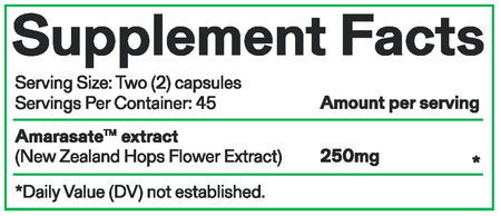Amarasate™ extract (New Zealand Hops Flower Extract). Other Ingredients: Canola oil (GMO and Glyphosphate free), Rosemary leaf extract, Vegetarian capsule (hypromellose). Contains NO: GMO ingredients, glyphosphate, wheat, corn, starch, yeast, soy, fish, peanuts, tree nuts. No artificial preservatives, flavors or preservatives.