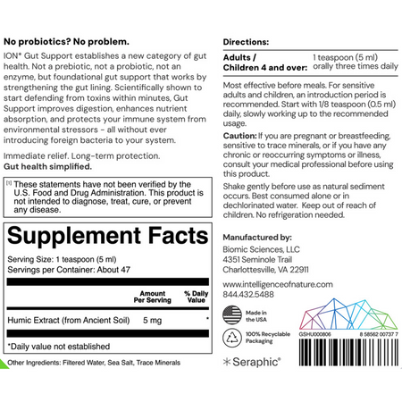 - ION Intelligence of Nature Gut Support is a dietary supplement containing 5 mg of humic extract from ancient soil per serving.