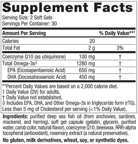 purified deep sea fish oil (from anchovies, sardines, mackerel, and herring), soft gel capsule (gelatin, glycerin, purified water, carob color, natural flavor), coenzyme Q10, beeswax, RRR-alpha tocopherol (antioxidant), rosemary extract (a natural preservative).