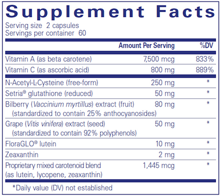- Provides 80 mg bilberry extract (Vaccinium myrtillus fruit, standardized to 25% anthocyanosides), 50 mg grape extract (Vitis vinifera seed, standardized to 92% polyphenols), 10 mg FloraGLO® lutein, and 2 mg zeaxanthin.