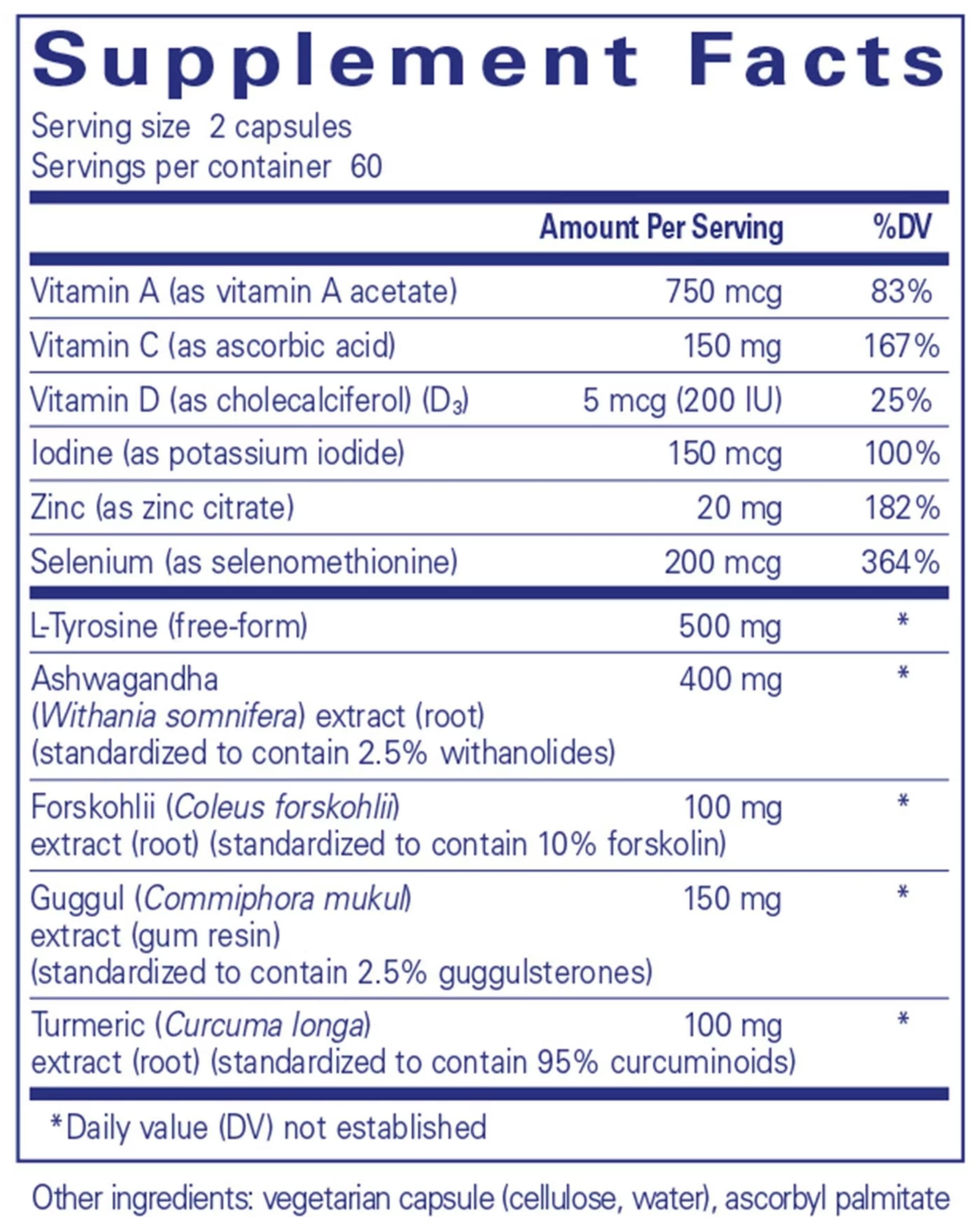 - Provides 500 mg L-tyrosine (free-form), 400 mg ashwagandha extract (Withania somnifera root, standardized to 2.5% withanolides), 100 mg forskohlii extract (Coleus forskohlii root, standardized to 10% forskolin), 150 mg guggul extract (Commiphora mukul gum resin, standardized to 2.5% guggulsterones), and 100 mg turmeric extract (Curcuma longa root, standardized to 95% curcuminoids).