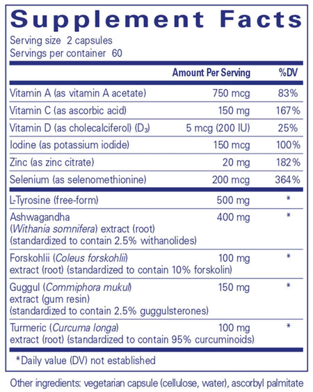 - Pure Encapsulations Thyroid Support Complex is a dietary supplement containing a comprehensive blend of vitamins, minerals, amino acids, and herbal extracts.