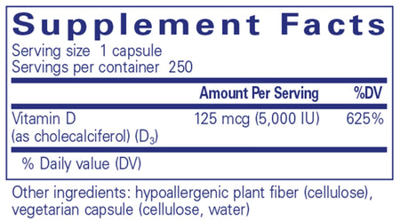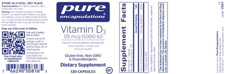 - Pure Encapsulations Vitamin D3 125 mcg (5,000 IU) is a dietary supplement containing cholecalciferol (vitamin D3).