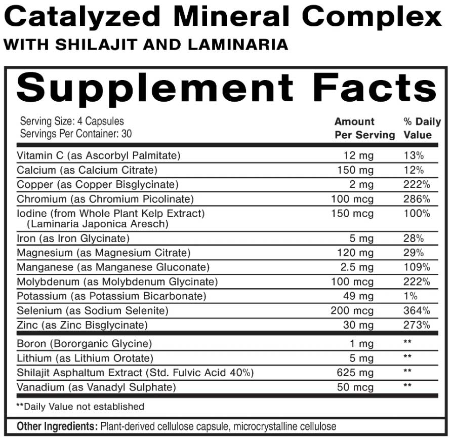 Vitamin C (as ascorbyl palmitate), calcium (as calcium citrate), copper (as copper bisglycinate), chromium (as chromium picolinate), iodine (from whole plant kelp extract Laminaria Japonica Aresch), iron (as iron glycinate), magnesium (as magnesium citrate), manganese (as manganese gluconate), molybdenum (as molybdenum glycinate), potassium (as potassium bicarbonate), selenium (as sodium selenite), zinc (as zinc bisglycinate), boron (bororganic glycine), lithium (as lithium orotate), shilajit asphaltum extract (standardized to 40% fulvic acid), vanadium (as vanadyl sulphate), plant-derived cellulose capsule, microcrystalline cellulose.