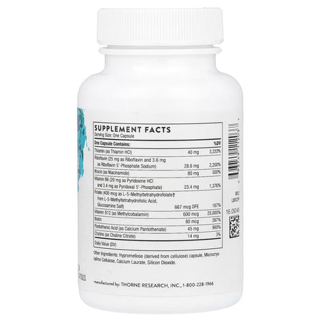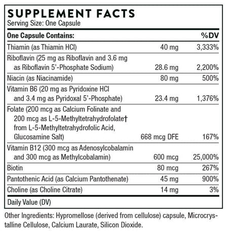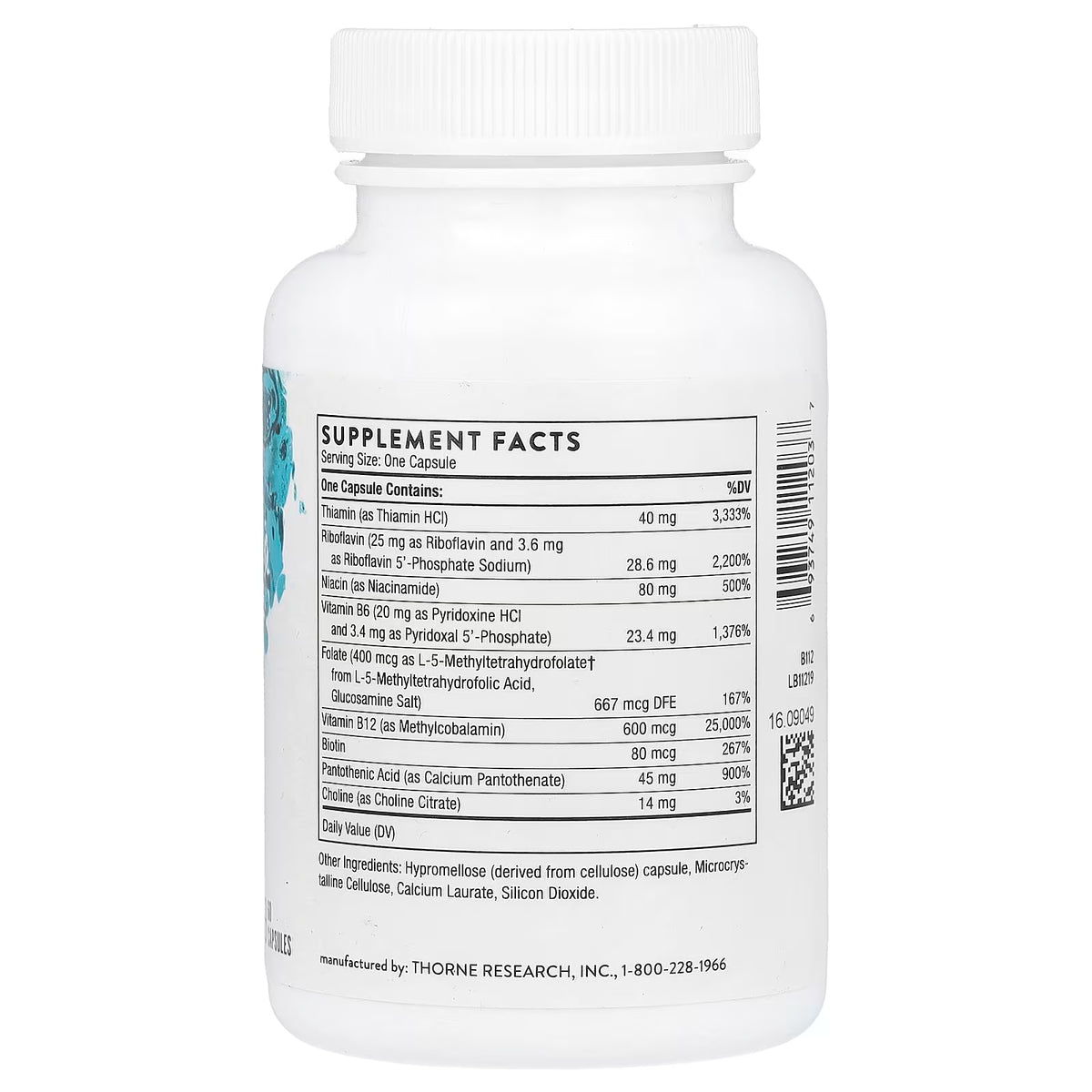 - Thorne B-Complex #12 is a dietary supplement containing 40 mg thiamin (as thiamin HCl), 28.6 mg riboflavin (25 mg as riboflavin and 3.6 mg as riboflavin 5'-phosphate sodium), 80 mg niacin (as niacinamide), 23.4 mg vitamin B6 (20 mg as pyridoxine HCl and 3.4 mg as pyridoxal 5'-phosphate), 667 mcg DFE folate (400 mcg as L-5-methyltetrahydrofolate from L-5-methyltetrahydrofolic acid, glucosamine salt), 600 mcg vitamin B12 (as methylcobalamin), 80 mcg biotin, 45 mg pantothenic acid (as calcium pantothenate), and 14 mg choline (as choline citrate) per capsule.