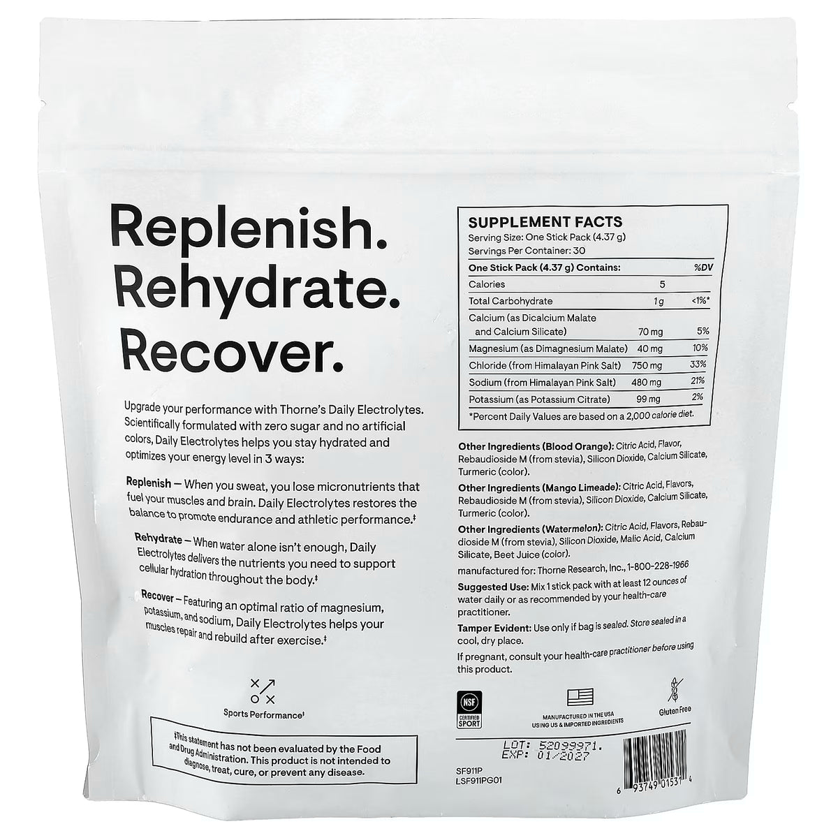 - Thorne Daily Electrolytes Variety Pack is a dietary supplement containing 480 mg sodium, 750 mg chloride from Himalayan Pink Salt, 70 mg calcium, 40 mg magnesium, and 99 mg potassium per stick pack.