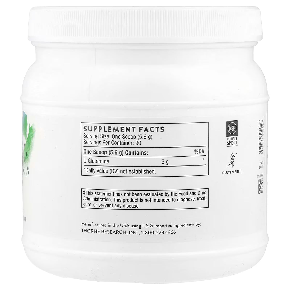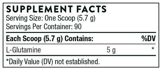 - Thorne L-Glutamine Powder is a dietary supplement containing 5 g (5,000 mg) of L-glutamine per one-scoop serving.