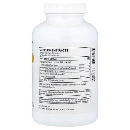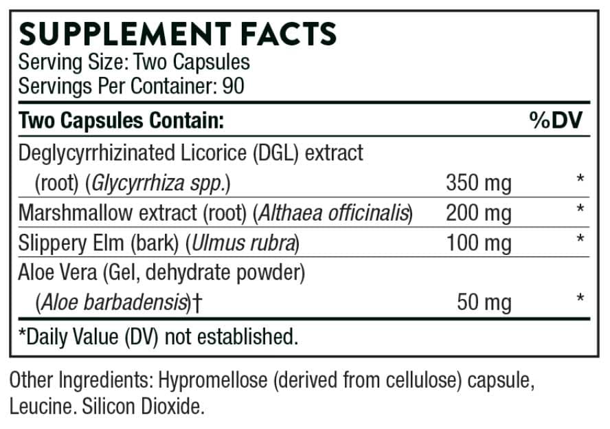 - Thorne GI-Relief is a dietary supplement containing 350 mg deglycyrrhizinated licorice (DGL) extract, 200 mg marshmallow root extract, 100 mg slippery elm bark, and 50 mg aloe vera gel per two capsules.