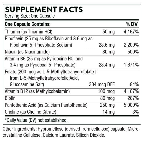 - Thorne Stress B-Complex is a dietary supplement containing 50 mg thiamin, 28.6 mg riboflavin, 80 mg niacin, 28.4 mg vitamin B6, 334 mcg DFE folate, 100 mcg vitamin B12, 80 mcg biotin, 250 mg pantothenic acid, and 14 mg choline per capsule.