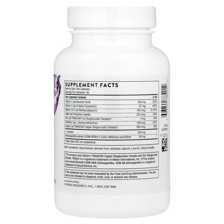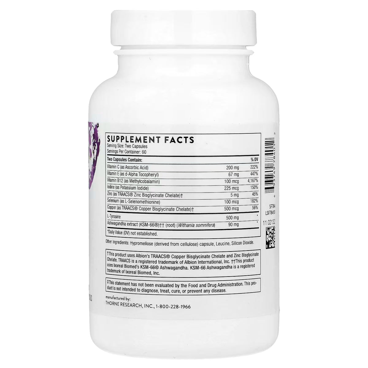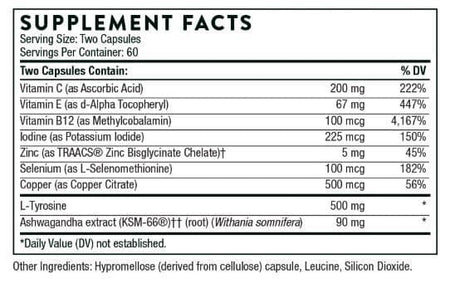 - Thorne Thyrocsin is a dietary supplement containing 200 mg vitamin C (as ascorbic acid), 67 mg vitamin E (as d-alpha tocopheryl), 100 mcg vitamin B12 (as methylcobalamin), 225 mcg iodine (as potassium iodide), 5 mg zinc (as TRAACS zinc bisglycinate chelate), 100 mcg selenium (as L-selenomethionine), 500 mcg copper (as TRAACS copper bisglycinate chelate), 500 mg L-tyrosine, and 90 mg ashwagandha extract (KSM-66) (root) from Withania somnifera per two capsules.