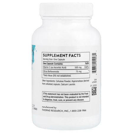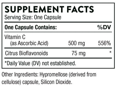 - Thorne Vitamin C with Flavonoids is a dietary supplement containing 500 mg vitamin C as ascorbic acid and 75 mg citrus bioflavonoids per capsule.