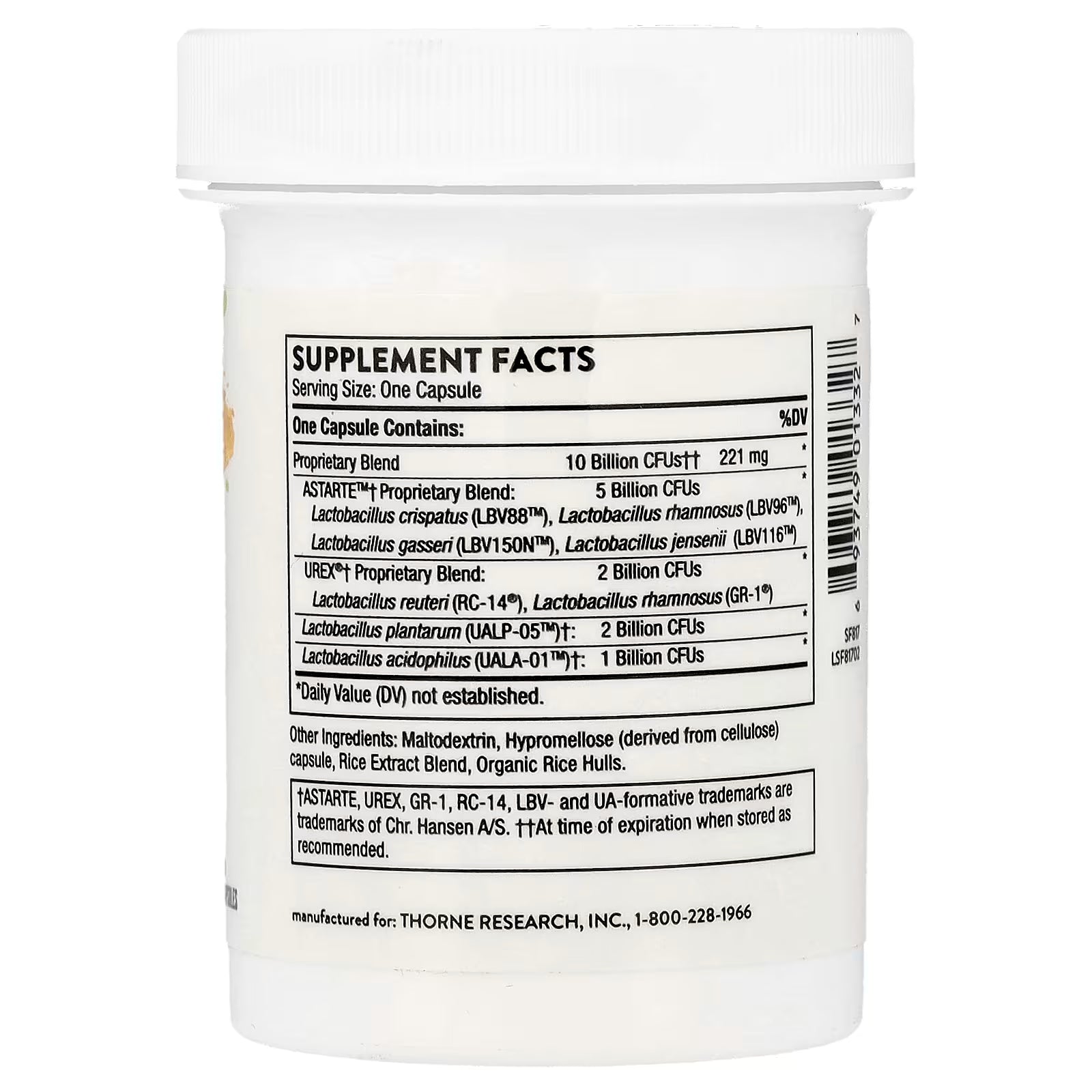 - Thorne Women's Daily Probiotic is a dietary supplement containing 10 billion CFUs proprietary blend (221 mg) per capsule with 8 Lactobacillus strains.
