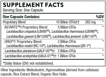 - Contains ASTARTE proprietary blend (5 billion CFUs): Lactobacillus crispatus (LBV88™), Lactobacillus rhamnosus (LBV96™), Lactobacillus gasseri (LBV150N™), Lactobacillus jensenii (LBV116™); UREX proprietary blend (2 billion CFUs): Lactobacillus reuteri (RC-14®), Lactobacillus rhamnosus (GR-1®); Lactobacillus plantarum (UALP-05™) (2 billion CFUs); and Lactobacillus acidophilus (UALA-01™) (1 billion CFUs).
