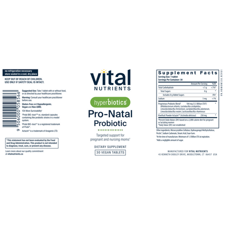 - Vital Nutrients Hyperbiotics Pro-Natal Probiotic is a dietary supplement containing a proprietary blend of six probiotic strains and kiwifruit powder.