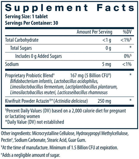 - Contains 184 mg (5.5 billion CFU) proprietary probiotic blend including Bifidobacterium infantis, Lactobacillus acidophilus, Limosilactobacillus fermentum, Lactiplantibacillus plantarum, Limosilactobacillus reuteri, and Lacticaseibacillus rhamnosus, plus 250 mg kiwifruit powder Actazin (Actinidia deliciosa) per tablet.